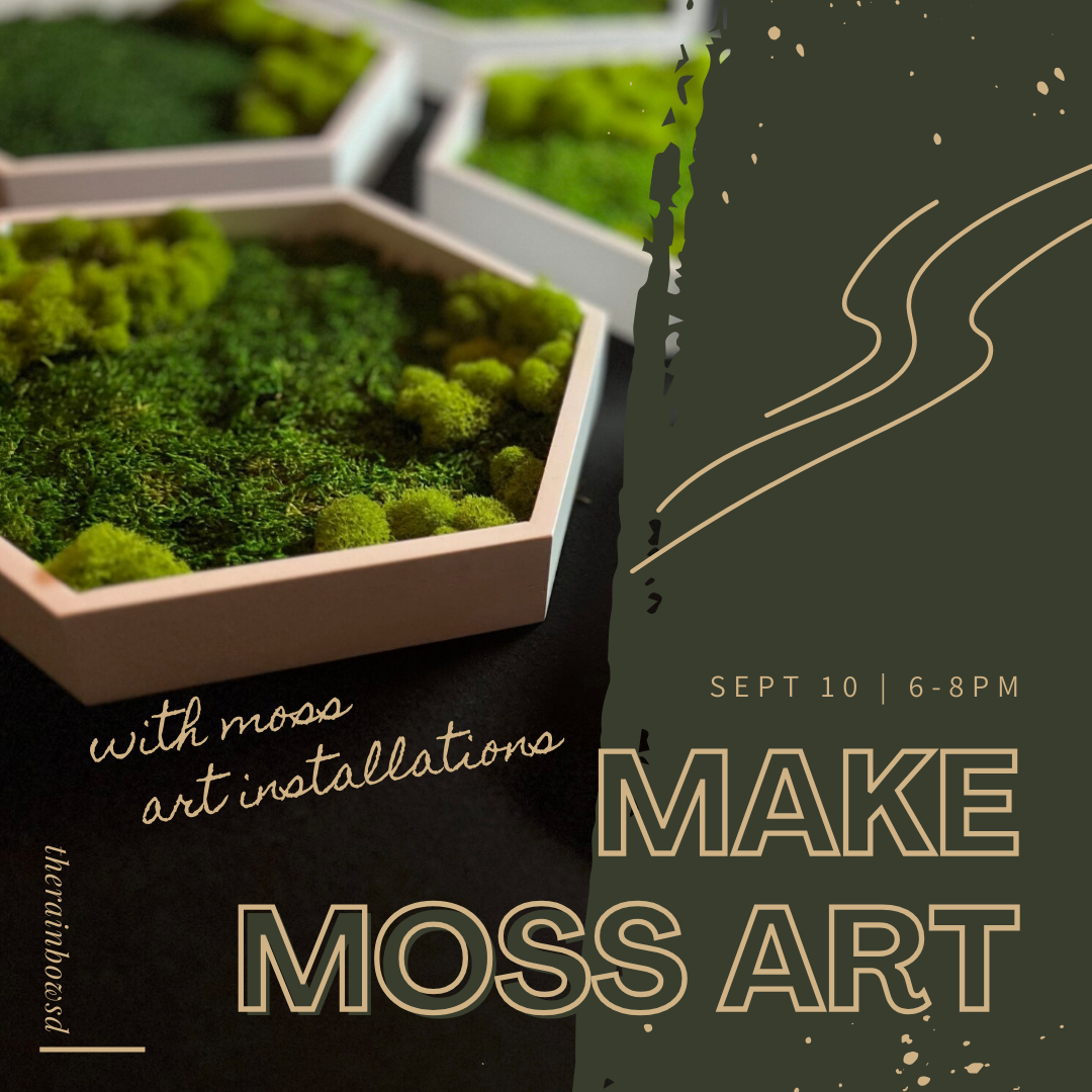 The Rainbow is thrilled to host September’s MAKE and we’re making mini moss art creations with James of Moss Art Installations. Each attendee will create 3 mini hexagon pieces with magical moss materials, stones, and more. All materials and instruction will be provided, however if you would like to bring meaningful stones, shells, or other natural materials, please feel free! Drinks and snacks are included.